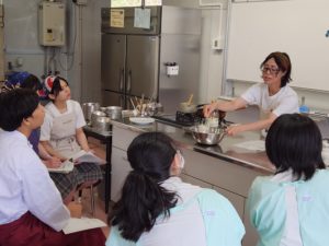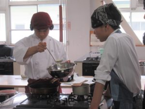 〇その後、実際に地元の食材の美味しさを体感してもらうために、「地元の米粉と季節のフルーツのパンケーキ」の調理体験を行いました。2つのグループに分かれ、米粉と豆乳を使ったパンケーキを焼き、木苺とブルーベリーに甜菜糖を加えて煮詰めたトッピングを作りました。