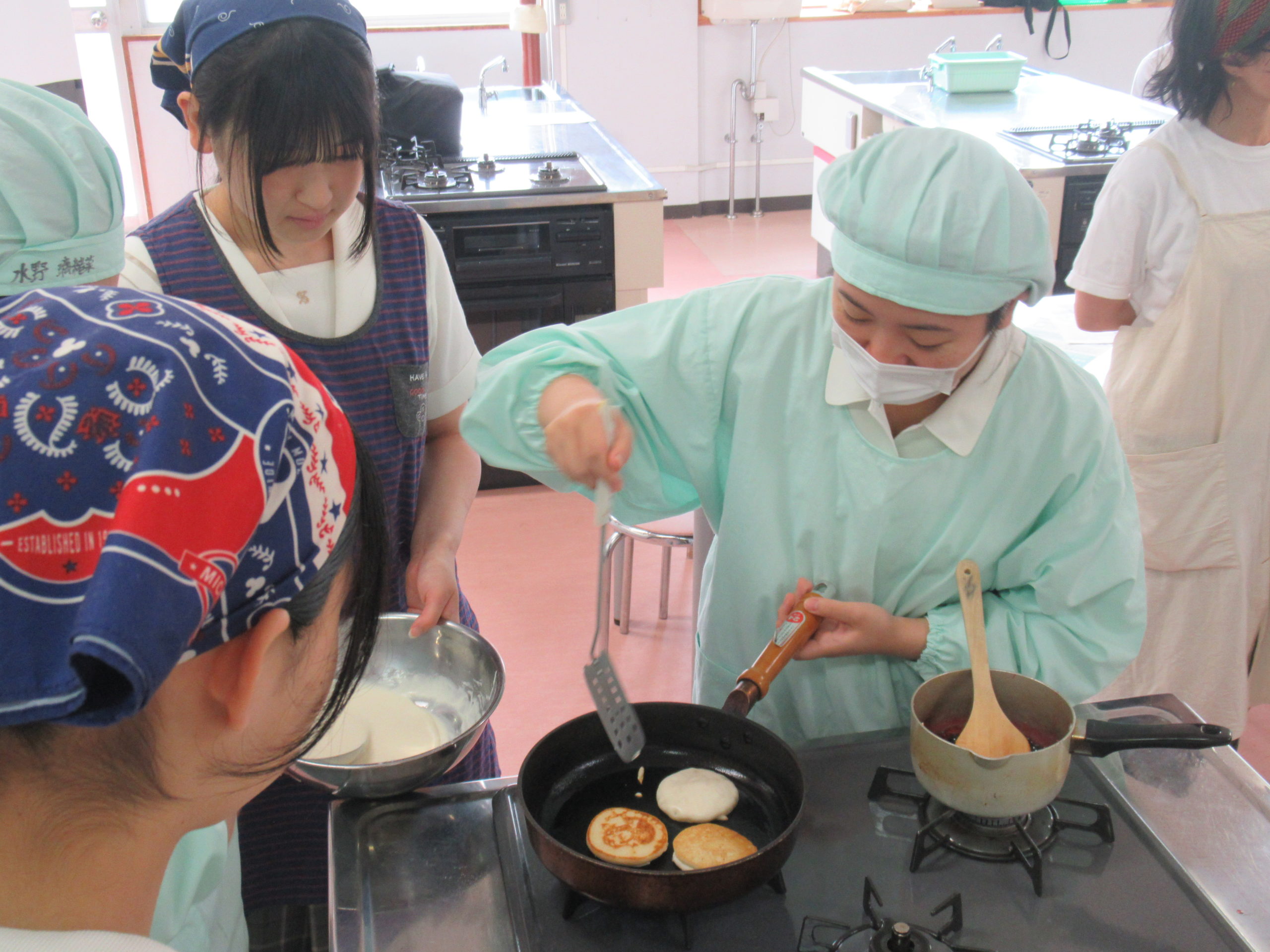 今年度から始まった出張coagari学習会の2校目を、7月16日(水曜日)に坂下高校で開催しました。「地域の美味しいを体感!店舗を持たないおやつ屋さんと地産地消のお菓子作り」と題し、地域探究科の2、3年生8人を対象に、地産地消の食材を使ったパンケーキ作りを行いました。